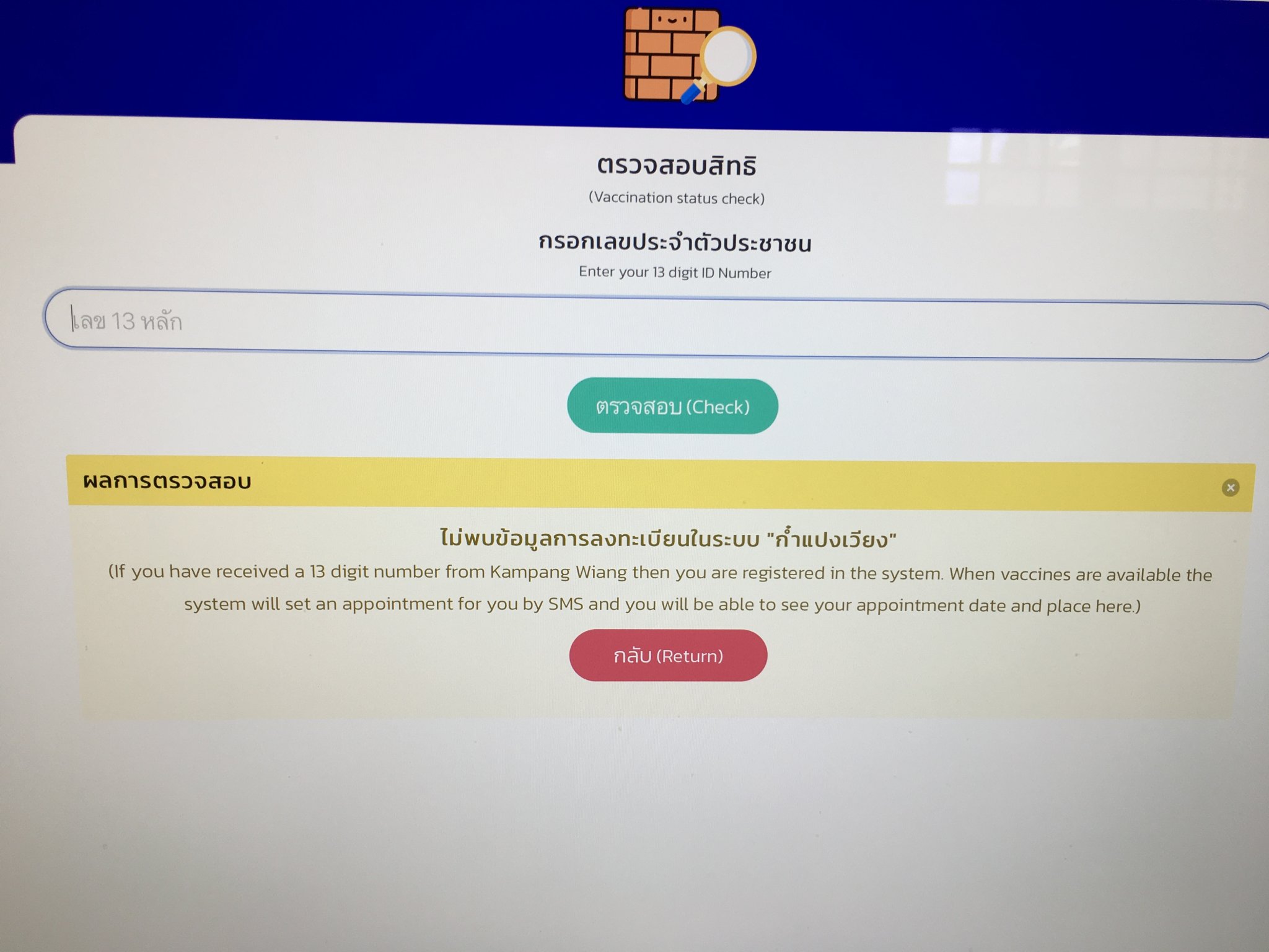 Not correct. The ONLY way to check whether your registration was successful is by entering whichever form of identification you used to register, viz. either passport number or pink id card number. Several weeks ago I input the 13 digit number and received the same response as you. As I used my pink id card to register I then did another check using that and was advised of the date, time & hospital to attend for my AZ vaccination. My friends who do not have a pink id card registered using their passport numbers. They both input their passport numbers to check their registrations and also received date, time & hospital. We've all received our first AZ jabs. If the system is saying you're not registered when you input your passport number, register again ( it won't reject you saying you've already registered ) and then when you finish the registration check the registration inputting whichever form of identification you used to register.