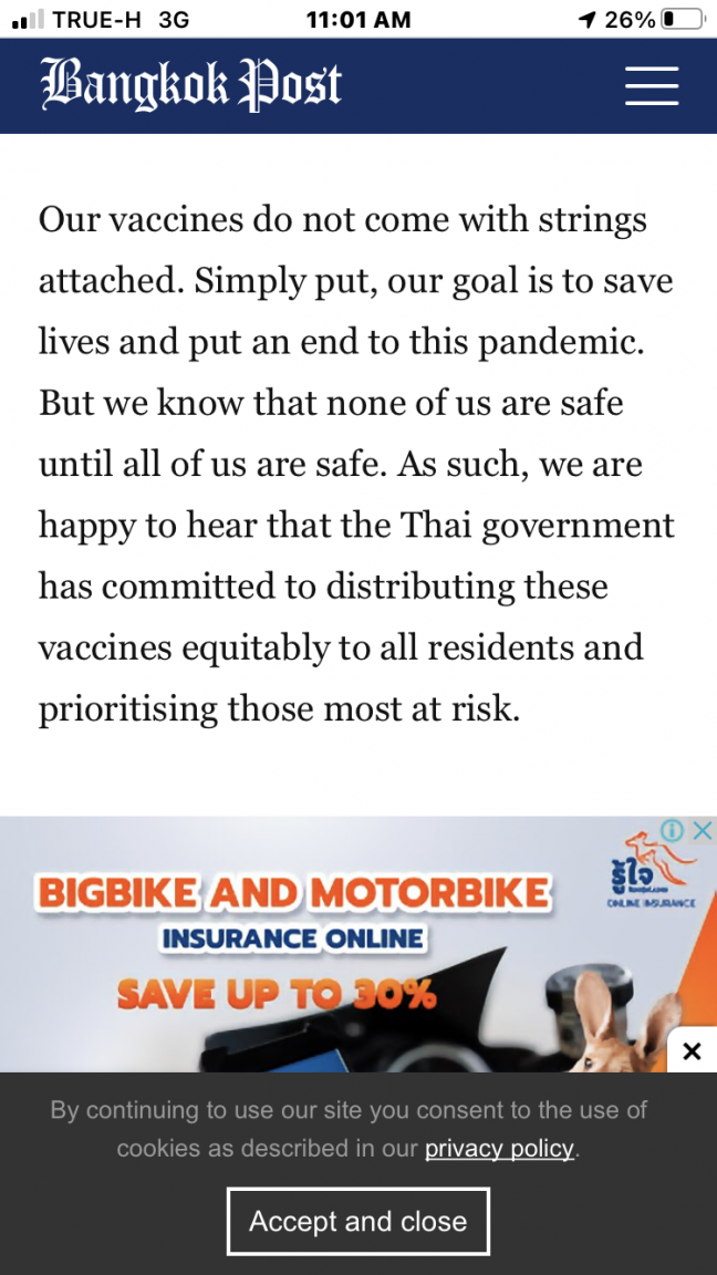 The news comes as the Prime Minister on Friday confirmed that some of the Pfizer vaccines recently donated by the United States will be given to foreigners in Thailand.
