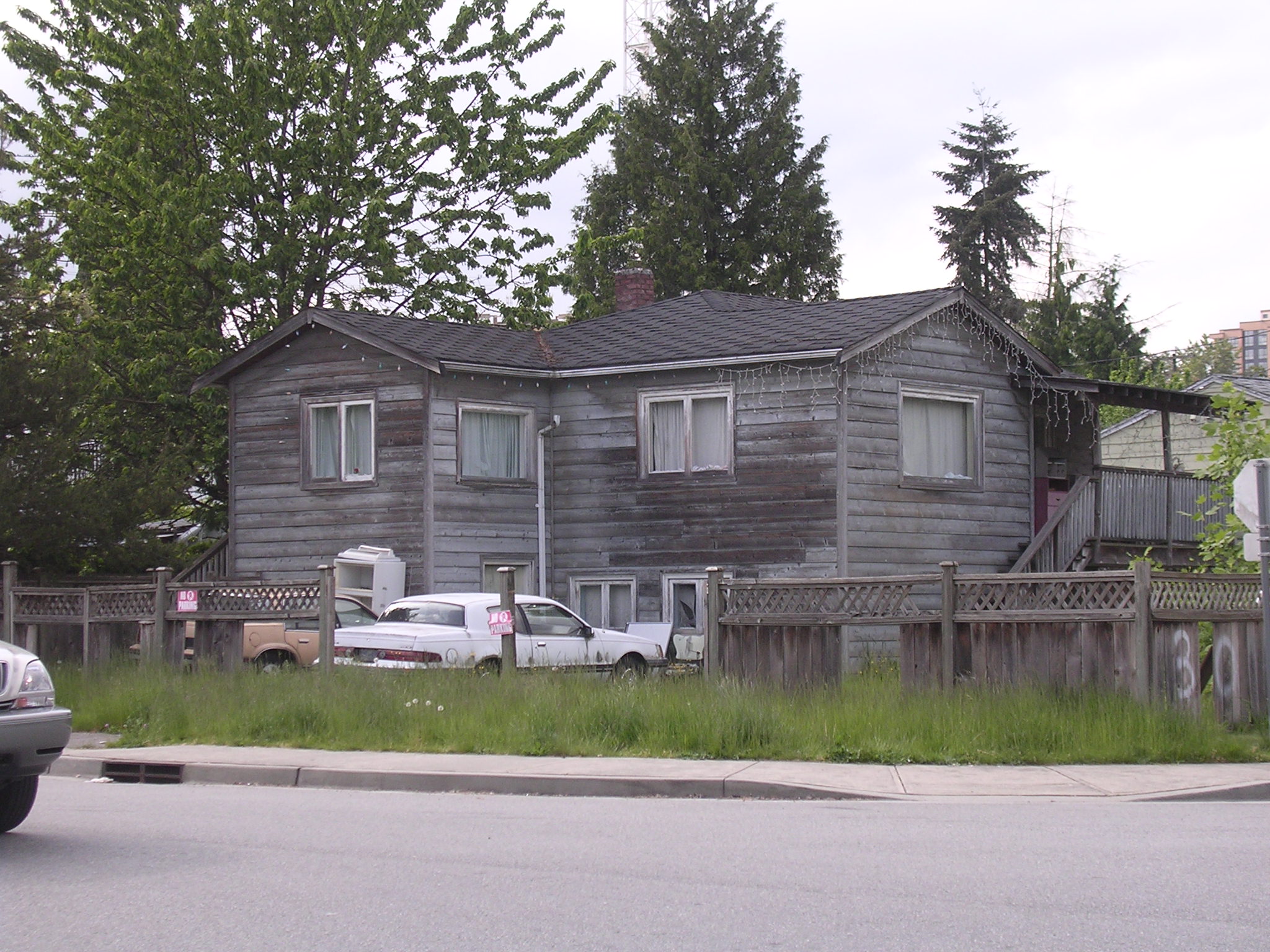 Besides the car wrecks, an old sofa and broken swingset grace the yard here. But the fairy lights are pretty.