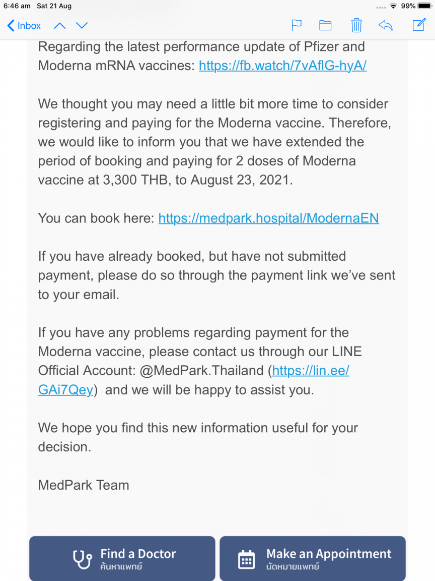 This morning I got a email from MedPark, that they are again taking reservation part 2?  for the Moderna 3300 baht is this the reason for the decline TIMING?????