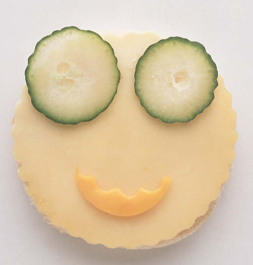Muffin covered with cheese, cucumber eyes and cheese mouth, but is it art? :o