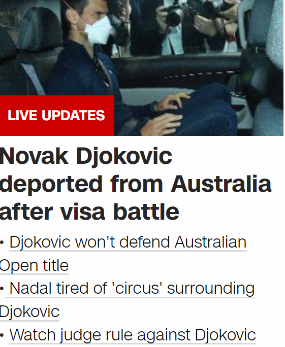 In any event, Djokovic's chances of obtaining a US visa to enable him to participate in the American Open in August/September now appear, to all intents and purposes, to be zero, thankfully.
