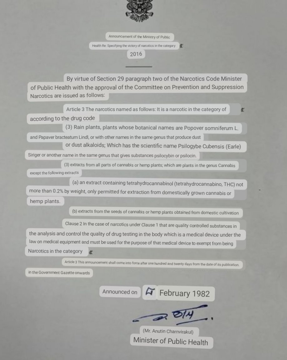 Mr Anutin said the Narcotics Control Board endorsed the Public Health Ministry’s draft announcement on the list of Category 5 narcotics and the Food and Drug Administration received an approval letter from the Justice Ministry for it to finalize the announcement.