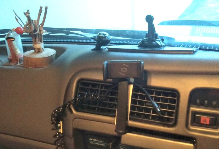 On the top of the dashboard there is a very small compass to the left of a very strongly held base unit from an old Garmin navigation system that was given to me by a mate when he upgraded to a newer one. I never used it and now can't find the device - I could've stuck the phone holder to its screen!