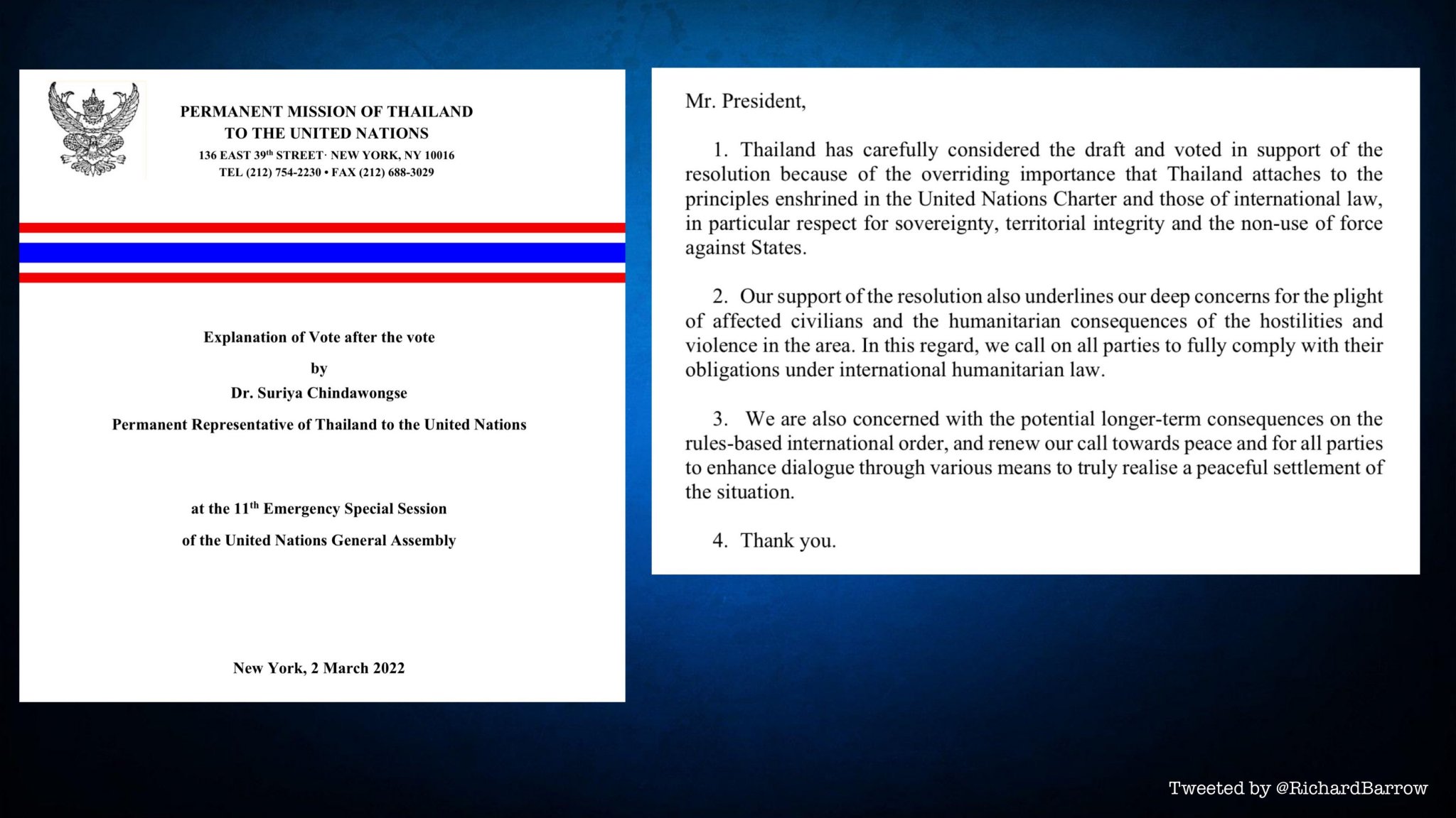 THAI NEWS REPORTS: Statement by Dr. Suriya Chindawongse, Permanent Representative of Thailand to the UN before the 11th Emergency Special Session of UNGA on 1st March 2022.