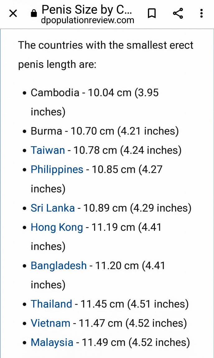 April 18, 20223 yr Here is the whole list but in centimeters. Thailand is in 80th place. There is also a link to average breast sizes on the page if you are more interested in that. International penis sizes compared (worlddata.info)