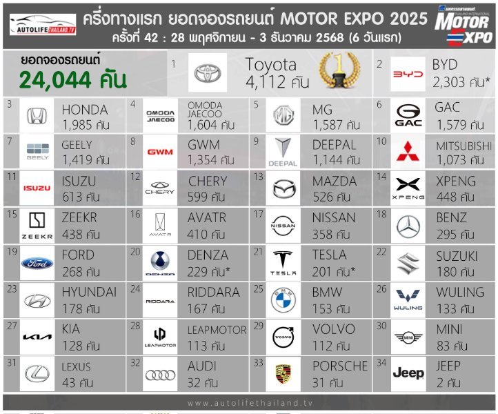 Half way through first 6 days ! Car reservation total in the 42nd Motor Expo 2025 (28 Nov – 3 Dec 68) : Total 24,044 cars | 1st place Toyota 4,112 cars followed by 2nd place BYD 2,303 cars and 3rd place Honda 1,985 cars.