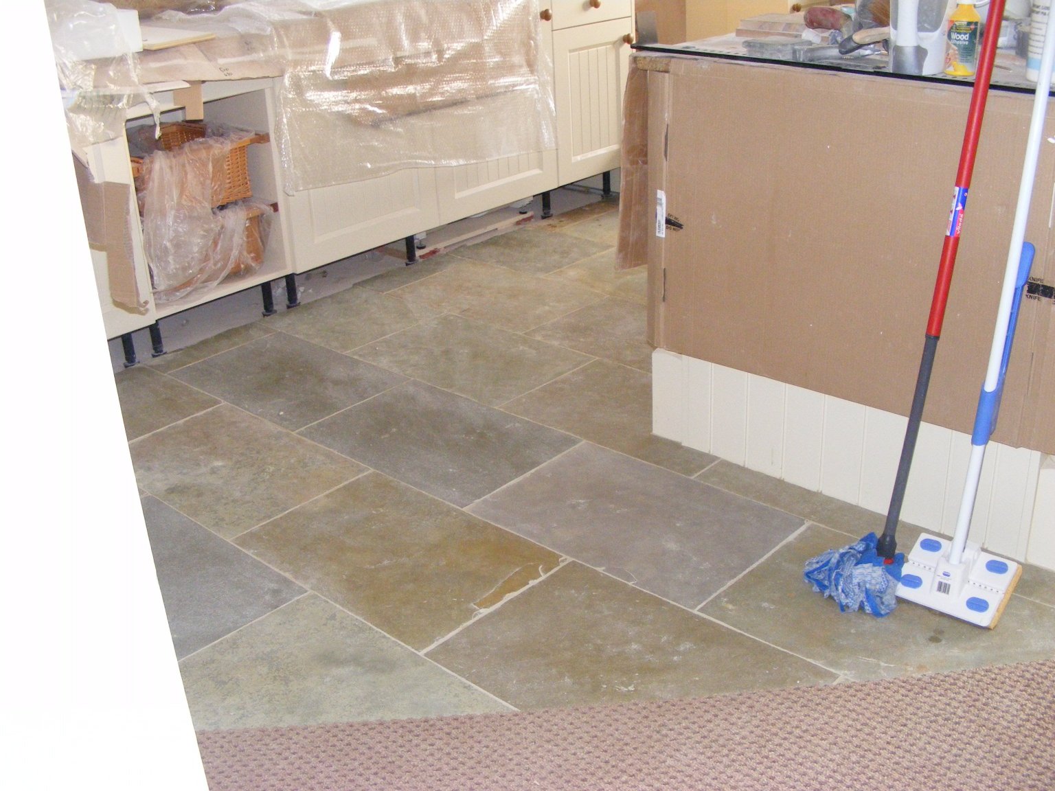 that wet room had just been grouted and washed off so still a bit hazy, you can see bits are still wet, they were natural stone and cost a kings ransom, and was floor to ceiling, had to re-enforce the walls to take the weight, one wall had half a ton in stone slabs, fixed on  a waterproof backer board, stone chosen by the house owner, i don't have to like them to lay them, it was a refurbishment, all the floors and walls were stone, here's a better photo of the same wetroom and the kitchen floor.