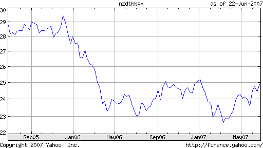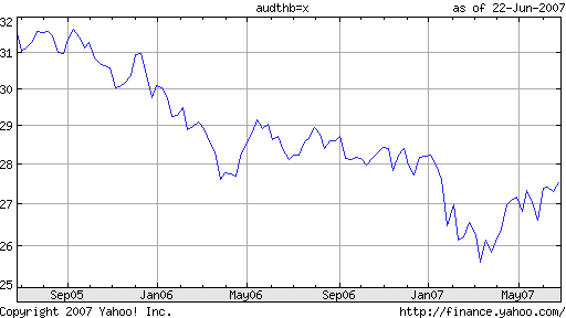 From around the beginning of Sept. '05 until bottoming out the 2nd week of March these currencies have fell drastically. Some currencies have recovered, but only marginally. The USD has remained steady between ฿33 and ฿32 for near on the past four months. Numbers are not completely accurate but close enough to get the idea across.