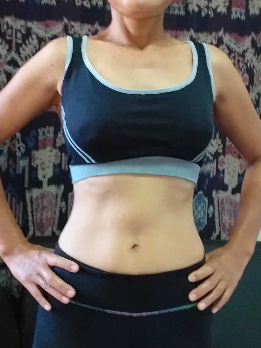 Gf and I are both in great shape 22 years later, tight bellies. We both diet and work out. She also does yoga. She was somewhat overweight when I met her, so, under my influence, she's followed the opposite course from your wife.