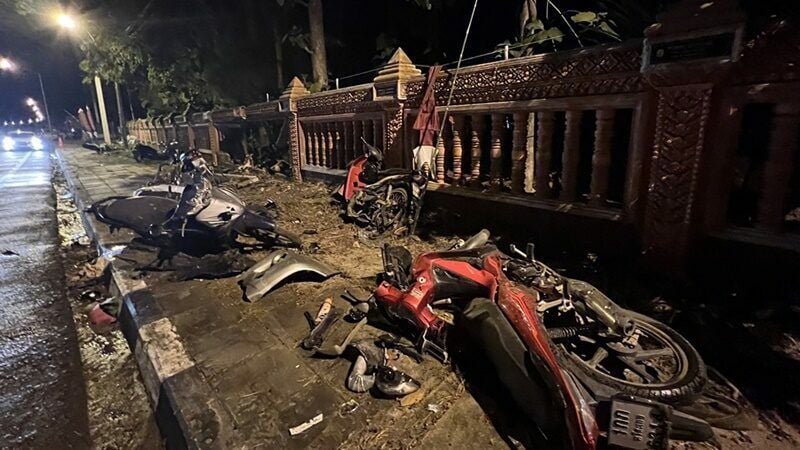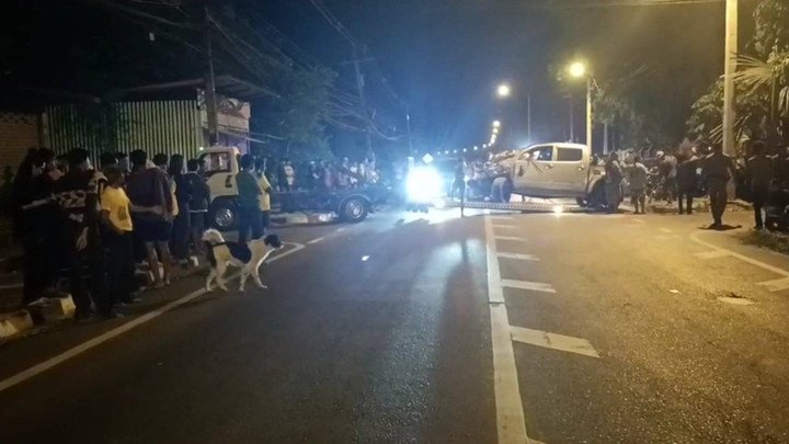 Very sad! A man from Nong Khai goes to drink alcohol at the Kathin ceremony in Sisaket. A pickup truck driver fell asleep and crashed into a motorcycle. 9 cars, 8 dead, 5 seriously injured.