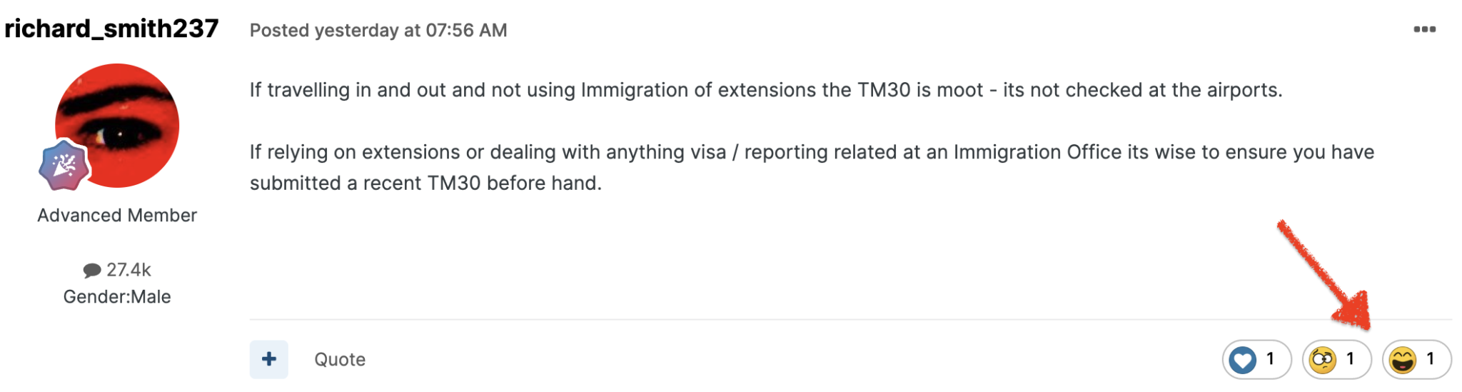 • Just do it (TM30) every time returning to the country (also if a hotel elsewhere registers you on their TM30 system). It costs nothing. Why leave yourself at the mercy of an immigration officer who ca