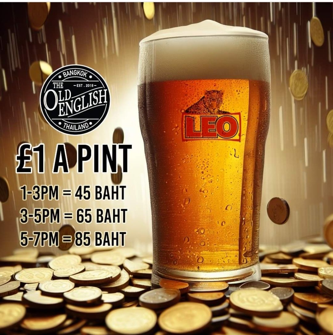 Opposite my home is the Old English Pub in Thonglor where they charge happy hour prices of 45 baht a pint of draught Leo (before 2pm) rising to 85 a pint before 7pm. But these prices are very, very much the exception in central Bangkok.