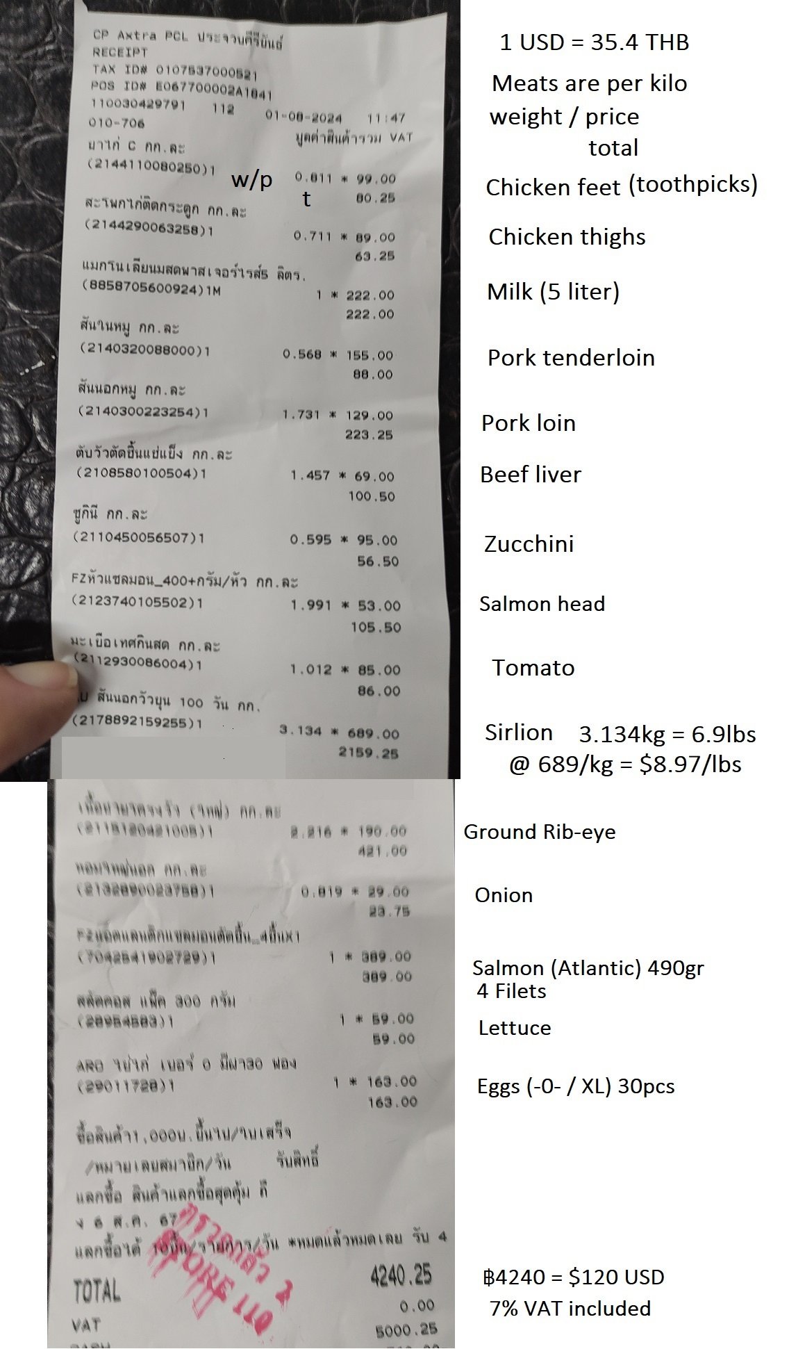 Since 1st of month, and just back from short O&A, frig sort of empty, thought I'd keep track for a month or more.  For them naysayer doubting we live on ฿15k a month.  Today's shopping, about 12kg of protein.