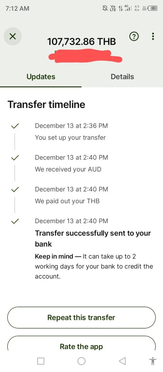 when did your Thai bank credit transfer to your account? Wise suggests up to 2 working days days.