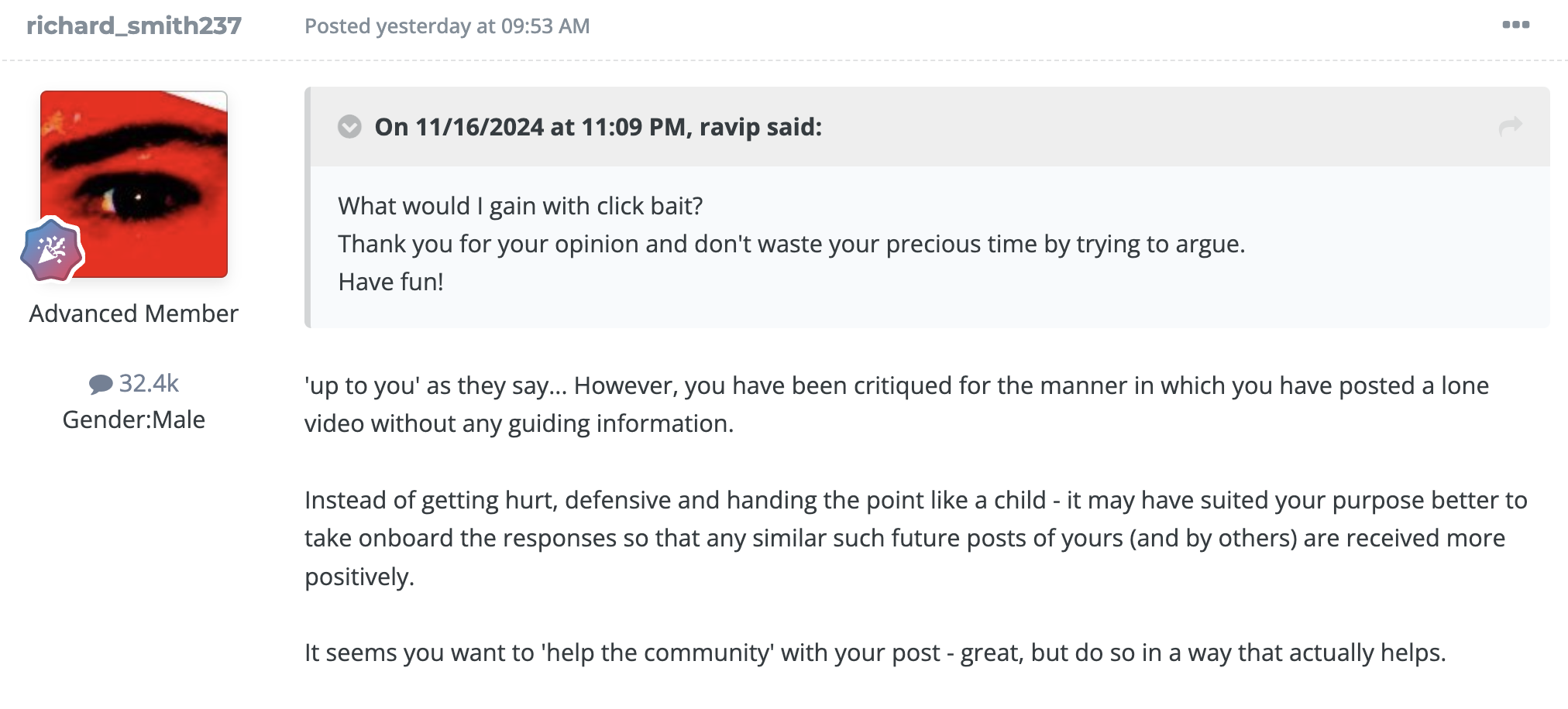 However, you are missing a little back story...    the Op posted a video yesterday, no accompanying comment, just the video and received criticism from a number of posters for not providing context.