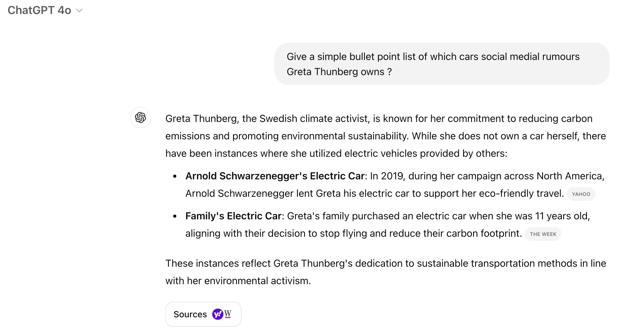 Due to a thread where Greta Thunberg was mentioned as owning 8 cars, I entered 2 questions in Google, and below are the answers I got from Google AI.