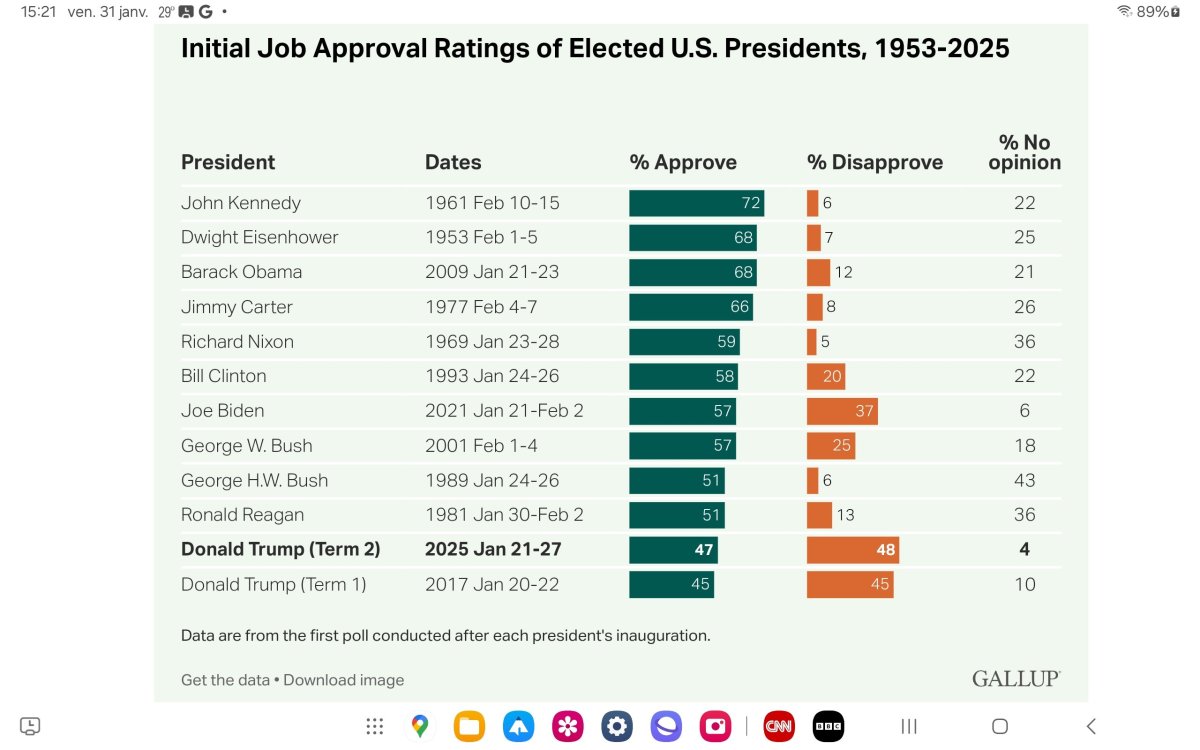 Reuters/Ipsos Poll (January 28, 2025): Shows a significant decline in Trump's approval rating to 45%, with disapproval rising to 46%.