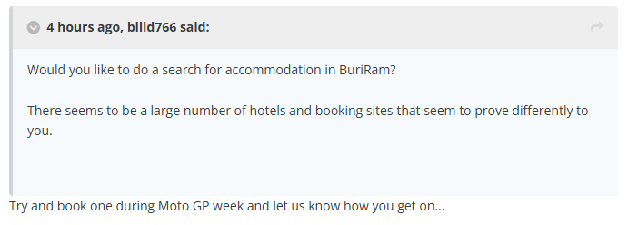 The F1 crowd want glamour and the best hotel rooms. I don't see the glamourati wanting to be anywhere but Bangkok which does not have a circuit. Buriram works for MotoGP because bike fans aren't venue/hotel snobs. They can't hold it early in the season because the pollution is too bad. They can't hold it from July through October because the rain will make it impossible - Formula 1 Powerboats is its own thing. April and May are too hot leaving November, perhaps between Vegas and Qatar is the only viable timeslot that will not overheat the drivers, bring too much attention to the pollution, or turn into a fiasco and cancelled events due to rain and possible flooding.