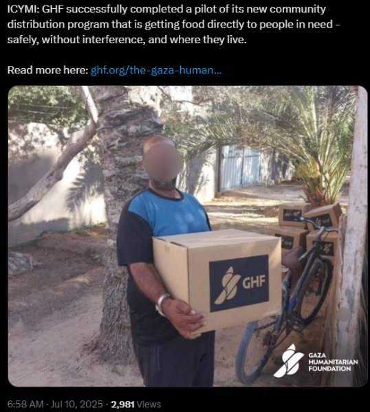 "The media refused to show you these photos of smiling Gazans picking up aid from the Gaza Humanitarian Foundation. Millions of meals safely distributed in just the last week. Who could possibly be against this?"