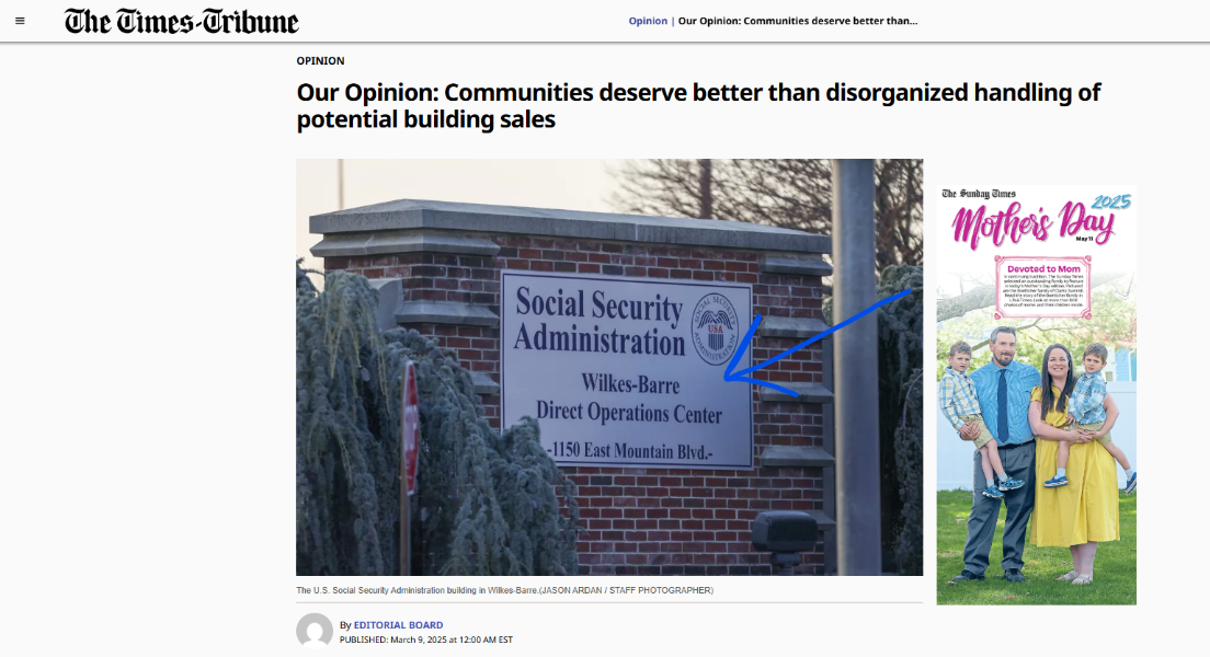 See below Google AI response and also a news article from the Times-Tribune news paper in Scranton PA for more details.  And with the SSA-wide employee reductions I expect Wilkes Barre has probably been hit hard.
