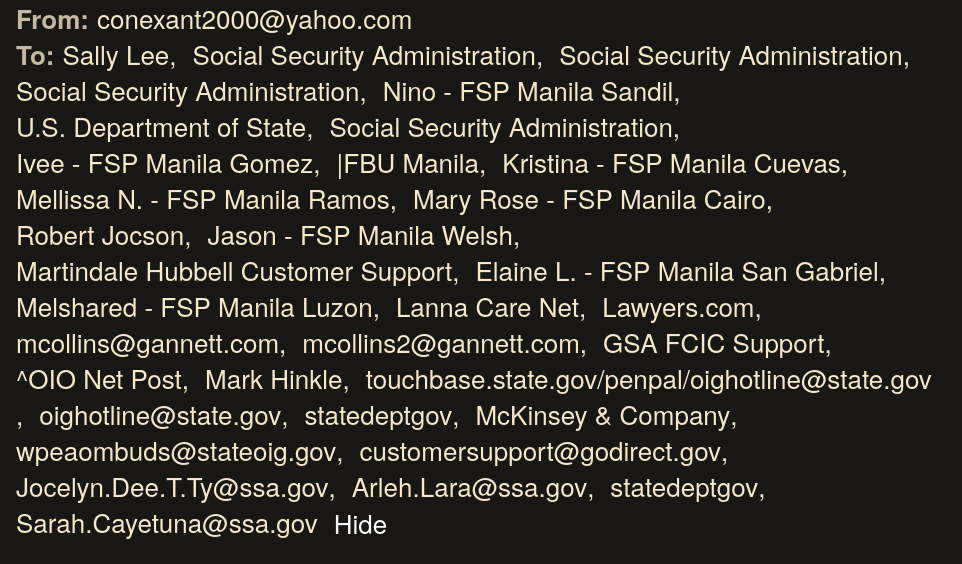 December 23, 2025Dec 23 it is an isolated ignored abondoned efort to help SEA retired USA citizens remain retired during their golden years, avoid manipulation abd exploitation by a hand full of untrained unmotivated SSA.GOV FICA paid swamp creatures. The waste of and theft of SSA.GOV funds are focused on fraud Medicare USA originated services and claims that services are denied as not available outside the USA. The young inexperienced SSA.GOV paid agents are protected by young untrained SSA.GOV software programers who have no solutions beyond blocking and deleting USA citizens outside the USA borders as hackers and as enemy of the state. The problem is when you have untrained managent of untrained young agents the solutions are simple swep under and hide under your desk wait for next pay check. There is only a hand ful of USA citizens outside the USA retired who did not apply face to face in person at a USA SSA.GOV ofice prior to foreign retirement and there fore these hand ful of USA citizens have ben isolated harased and treated as enemy of the state by SSA.GOV out of control agents. Al USA citizens want is to receive their basic simple SA.GOV FICA paid pension with no harasment and continuous investigations by untrained isolated remote SA.GOV contracted agents. The solutions are blocked by pig head rhino promoted agents retired outside the USA receiving high pay checks and living expenses acounts they mist protect and cover up to control the International SSA.GOV life style. The solutions of Artificial Inteligence and aces to MySSA account is on the horizon fiercly blocked by high salary FBU agents to preserve their pay checks. Login.GOV and IDme acounts do not work around the world but as declared by untrained SA.GOV programers can aces the MySSA acount with ful power of the Internet and can update 7162 SA.GOV fors with a simple click and Internet Global conections versus the stupid idiot waste of postal paid envelopes and time and labor to postal mail 7162 forms ANY THIEF CAN SIGN AND RETURN. Which one of you readers can stand up and instruct SA.GOV of the facts of security postal mailing 7162 forms and then paper mailing banking International Deposit forms that are seldom inspected and verified by scatered FBU agenst paid by SSA.GOV using travel and living expenses on top of their fat salary pay checks al total waste of FICA colected SA.GOV money. You al have the highest SECURITY PASSPORT validated as PROOF of yourUSA citizenship identification demanded by SSA.GOV benefits payment. No USA validated PASPORT no USA sa.GOV International Direct Deposit money. Where do you RENEW USA PASPORT at your local USA Embasy USA Citizens Services Window at AL USA EMBASY locations you must first enter secured by your USA PASSPORT You want your SA.GOV benefits paid you must have a USA passport and register your USA pasport with your foreign bank account who then isue your acount number Direct Deposit. Why FBU Manila blocked USA SA.GOV aces to MySA acount? to protect the FBU parasites collecting high pay checks and travel expenses from your SSA FICA pension money MySSA aces acount is a simple direct international Internet acces to your USA SSA.GOV account and has the direct tool to change your adres change your dead or alive and inform you update your USA sa.GOV bokeping account. Al over the GLOBE BANKS and FINANCIAL investments use ONE TIME PAS CODES ISUED TO SECURE YOUR MONEY the USA EMBASY WAS BLOCKED from isuing a one time pas code to your MySA acount. It is for the benefits of the FBU parasites to continue receiving pay checks and phone aplicants asking questions have you worked for the rail road are you receiving military pensions are you maried etc stupid questions that MySA can be used to enter under a OTP code blocked by FBU .