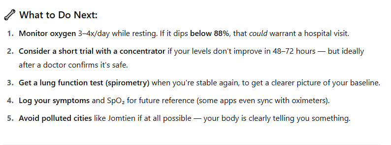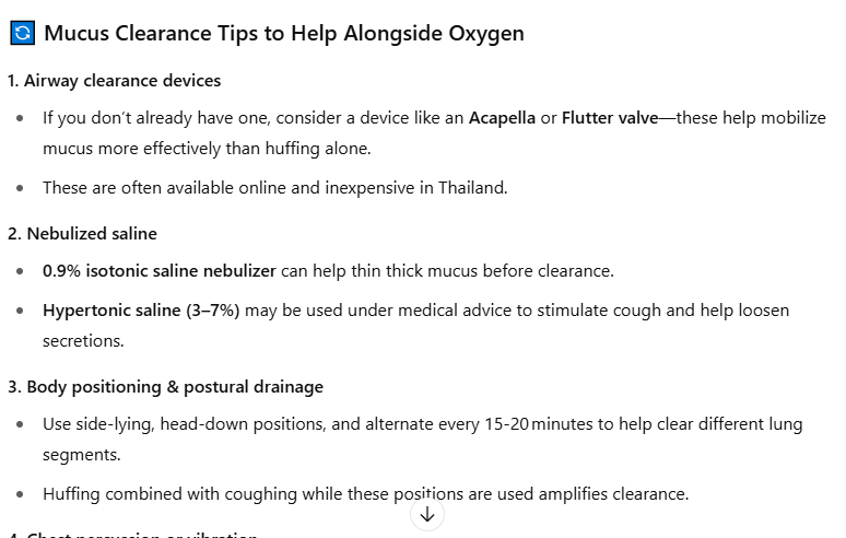 Thanks very much for the consultation with Chat GPT 🙂  Since I've had this illness for 25 years, I'm already fully aware of the various lung exercises, medicines and precautions that I need to take.  Because I follow these recommendations, my illness has not got worse in these 25 years, but I do have 'flare-ups' and at these times I can get a little short-breathed, but nothing that concerns me greatly - an oxygen concentrator is cheap to buy on Lazada, (or a small oxygen tank) could help.