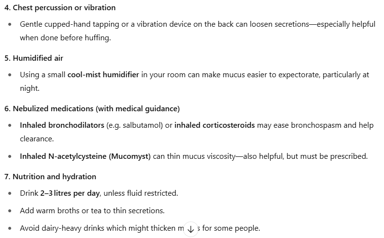 i also use an OPEP device, which you exhale into, it forces you to cough, and with the vibrating metal ball inside the device it helps loosen up flegm in the lungs so you cough it up.
