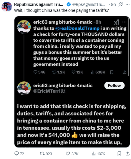 What is this idiocy? The tariffs are coming out of the pockets of your fellow Americans. Why on earth are you gloating about it as if it's a win? It's totally moronic!