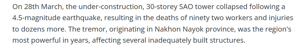 On 28th March, the under-construction, 30-storey SAO tower collapsed following a 7.7-magnitude earthquake, resulting in the deaths of ninety two workers and injuries to dozens more. The tremor, originating in Mandalay Myanmar, was the region's most powerful in years, affecting several inadequately built structures.
