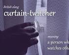 A "curtain twitcher" is a British slang term for someone who enjoys watching their neighbours, often from behind a curtain, to see what they are doing. It implies a degree of nosiness and is often used in a slightly disapproving or humorous way.