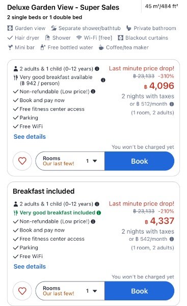 Once in Chiang Mai I wanted to extend  my booking which was around 1000 baht plus breakfastl[long time ago} but reception quoted me 1500 baht. I booked on line for 1000 baht plus breakfast  and reception  had no idea why that was so.I usually double check  my booking because I have been caught putting the wrong dates  and last year  a hotel in Antwerp cost me double the price with trip. It was my fault  hence the cheap rooms were all gone.  After complaining to trip.com  the company were good enough to give me $200 worth of credits.