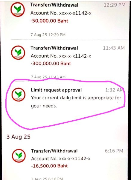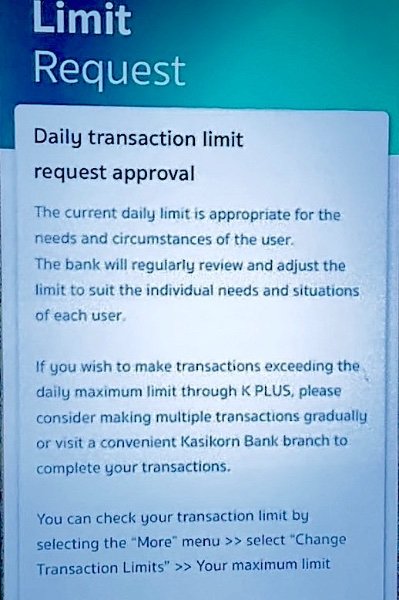 August 20, 2025Aug 20 Popular Post I wrote a letter to Bangkok Post a few weeks ago about this 50K limit nonsense but they didn't publish it - so here it is. The real kicker is that (with KBank at least), a request to increase the limit takes two days to consider and may even be rejected. And this isn't an 'anti-foreigner' thing - applies to all, nationality regardless. Given the relentless drive by banks to push customers not to visit branches and instead to rely on the ‘convenience’ of a banking app, imagine my surprise to now be encouraged, by Kasikorn Bank, to use cash for large transactions. Just last week I had the pleasure of withdrawing, at my local KBank branch, several hundred thousand baht of my hard earned money. I then carried the weighty envelope across the lobby of my office building to the branch of another local bank, where I deposited said funds. At this point I should point out that it was not originally my intention to eschew a single, traceable, online interbank transfer. In the past I have used my KBank app, such as when, in March, I made a single transfer of several hundred thousand baht to complete a car purchase. However, Kasikorn have now decided that a rather modest daily limit of THB 50,000 for all online transactions is sufficient for my banking needs. When I queried this with KBank Call Centre I was informed that this is a new policy but that it was possible to request an increase, via the Call Centre, although this would require two days’ consideration and any new transfer limit would be valid for just 30 days. I duly submitted the request but, sadly, it appears Kasikorn feel I am unable to control my spending: the response to my request (two days later) was to inform me “the current daily limit is appropriate for the needs and circumstances of the user”. This was accompanied by the helpful suggestion “if you wish to make transactions exceeding the daily maximum limit through K Plus, please consider making multiple transactions gradually or visit a convenient Kasikorn Bank branch to complete your transactions”. Deliberations aside as to how any bank feels able to determine the “needs and circumstances” of a customer, a system that prevents transfer of larger sums via a banking app de facto encourages use of cash in payment for goods and services – a stimulus for the informal economy, to be sure, but counter to the government’s efforts to promote electronic payments as this facilitates tax revenue collection. And what happens should an unfortunate customer find him or herself in urgent need to pay a bill above their preset limit? It is not uncommon for local private hospitals to require a deposit prior to admission in cases where the patient is uninsured: if at death’s door, ‘making multiple transactions gradually or visiting a branch’ is unlikely to be practicable. Perhaps Kasikorn might, at the very least, adjust their policy on temporary transfer limit increases to make decisions immediate and automatically approved, even if only for 30 days, much as with requests for a temporary credit card limit increase.