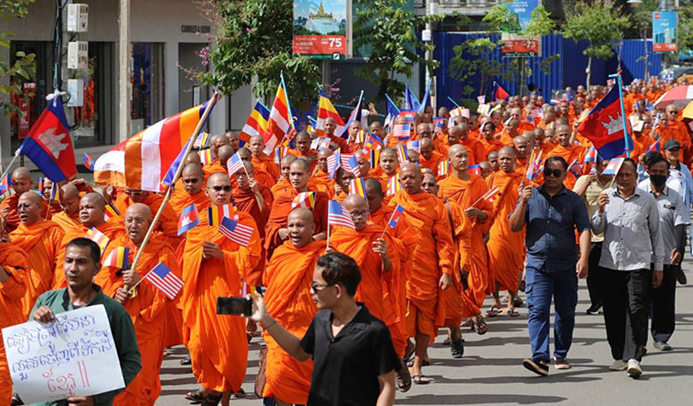 Yesterday's protest march in Siem Reap by thousands of people (including foreigners and ex-pats), led by monks, for the release of 18 Khmer soldiers captured by the Thai military AFTER the ceasefire began and asking for Donald Trump's  intervention (hence the USA flags along with Cambodian flags).