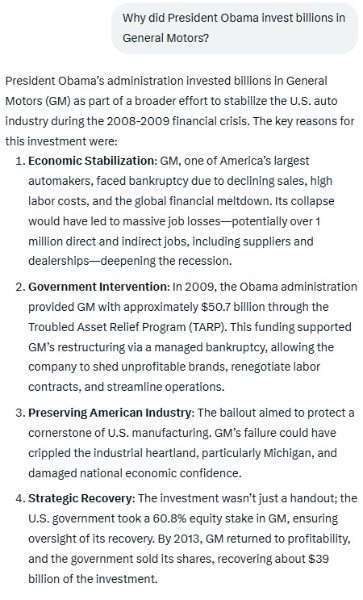 August 26, 2025Aug 26 Author 28 minutes ago, Mike_Hunt said: How about this? President Barack Obama struck a cautious note Monday as he announced the bankruptcy of General Motors and the government’s decision to invest another $30 billion in the company, take a 60% ownership stake in the beleaguered automaker, and take control of a number of slots on the board of directors. https://www.politico.com/story/2009/05/obama-reluctant-shareholder-in-gm-023165 How about it? Are you saying this was an ordinary investment? Grok:
