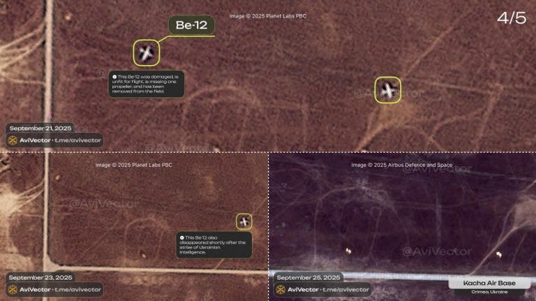 The photos show airfields in temporarily occupied Kacha and near Sevastopol, where an An-26 transport plane was destroyed and Be-12 amphibious aircraft were damaged.