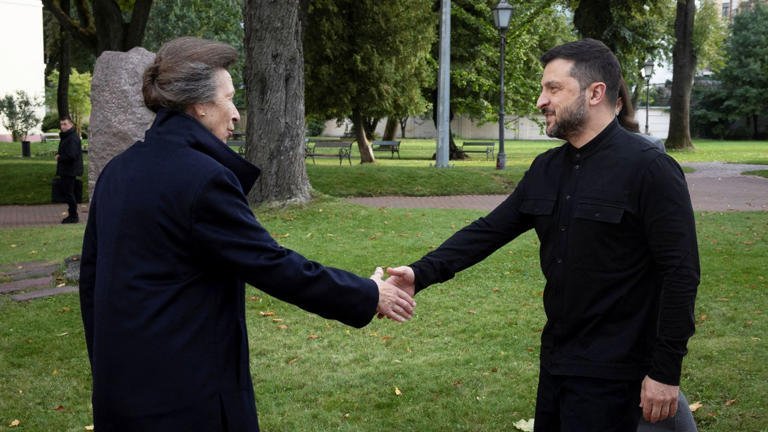 Princess Anne has placed a toy bear as a poignant tribute at a children's memorial in Ukraine, during an unexpected visit to the war-ravaged country where she also met Volodymyr Zelenskyy.