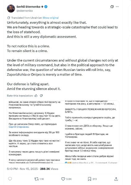 This is the latest view from major Ukrainian activist Serhii Sternenko, who has over 2 million subscribers and was a significant figure during Euromaidan. He’s essentially Ukraine’s equivalent of Igor Girkin, and the Russians have attempted to assassinate him three times so he’s definitely someone worth listening to