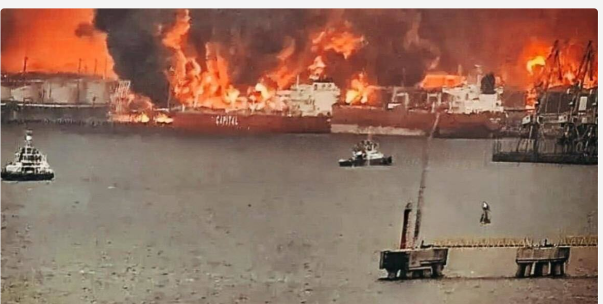 According to Ukraine’s General Staff, drones struck oil storage tanks and loading infrastructure at the port. A large fire broke out shortly afterwards, with tanks holding crude oil and petroleum products reportedly burning.