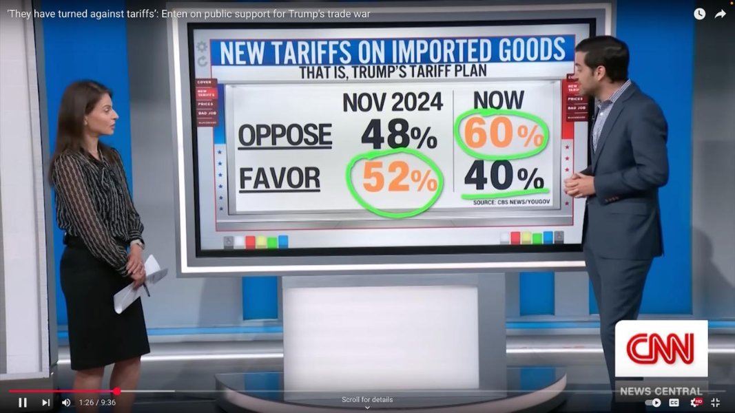 It would seem that the general public, including many of Trump's supporters, are no longer buying the bologna about who is paying for the tariffs. They are realizing that Trump was lying about exporters and importers paying for the tariffs, and that those costs will be passed down to the consumer. They are seeing prices increase, and they are realizing that this is nothing but a tax on the American public, which is likely going to result in  significant levels of inflation over the next couple of years.