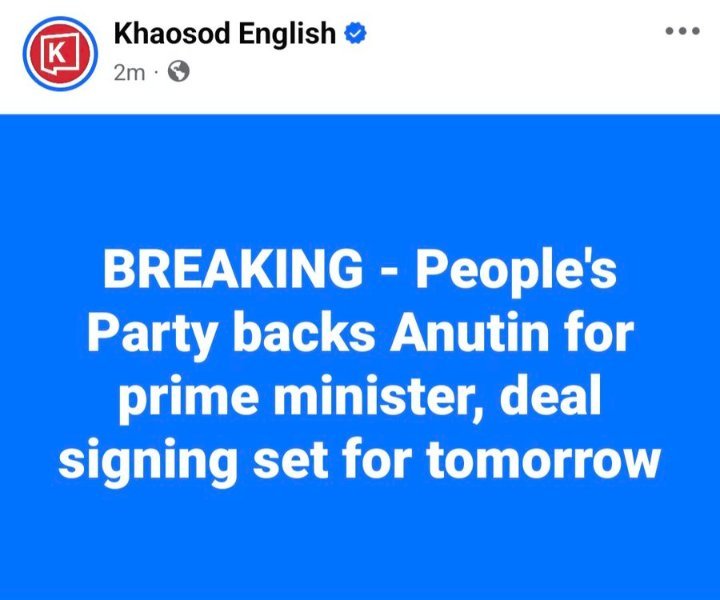 BREAKING - People's Party backs Anutin for prime minister, deal signing set for tomorrow