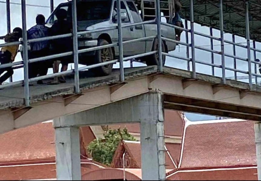 Pick-up Truck Stuck on Pedestrian Bridge After GPS Error   Picture courtesy of SiamRath.   A pick-up truck became stuck on a pedestrian bridge in front of Wat Ban Khom