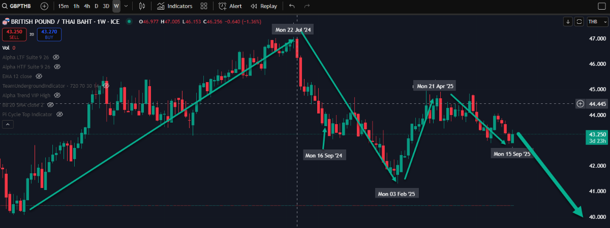 The GBP is worth pretty much exactly the same against the Baht as it was 12 months ago. 42.8 last year, 42.9 today.
