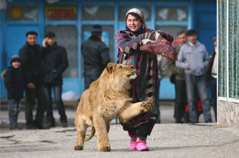 The lady in the pic with the lion looks to have him under control. Perhaps she brought him up as a cub.