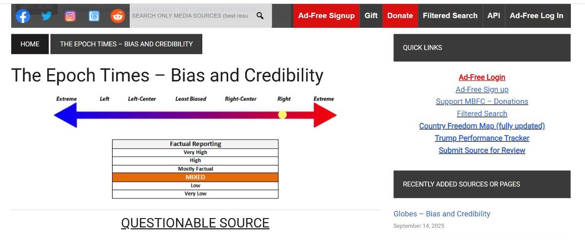 The Epoch Times – Bias and Credibility QUESTIONABLE SOURCE "Overall, we rate The Epoch Times Right Biased and Questionable based on the publication of pseudoscience and the promotion of prop