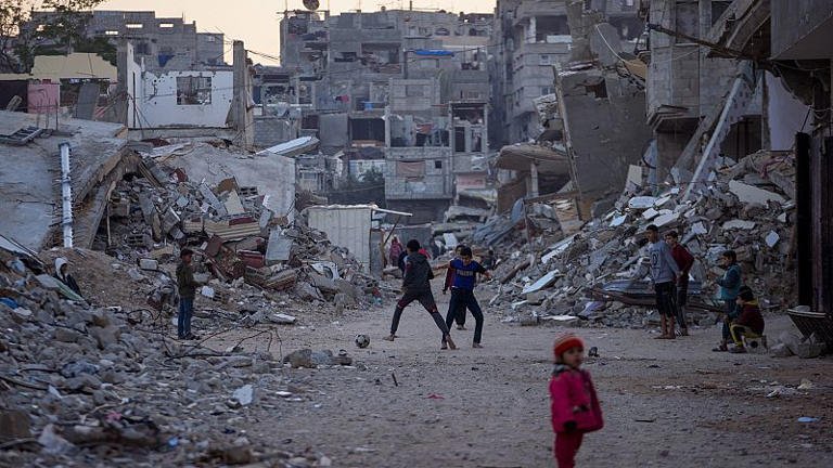 Palestinian children play next to buildings destroyed by Israeli army strikes© AP Photo