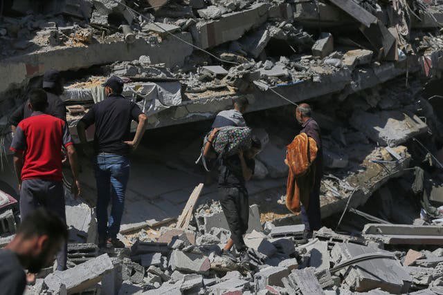Smoke rises as an evacuated residential building, which was housing displaced Palestinians, collapses after it was hit by an Israeli airstrike in Gaza City (Reuters)