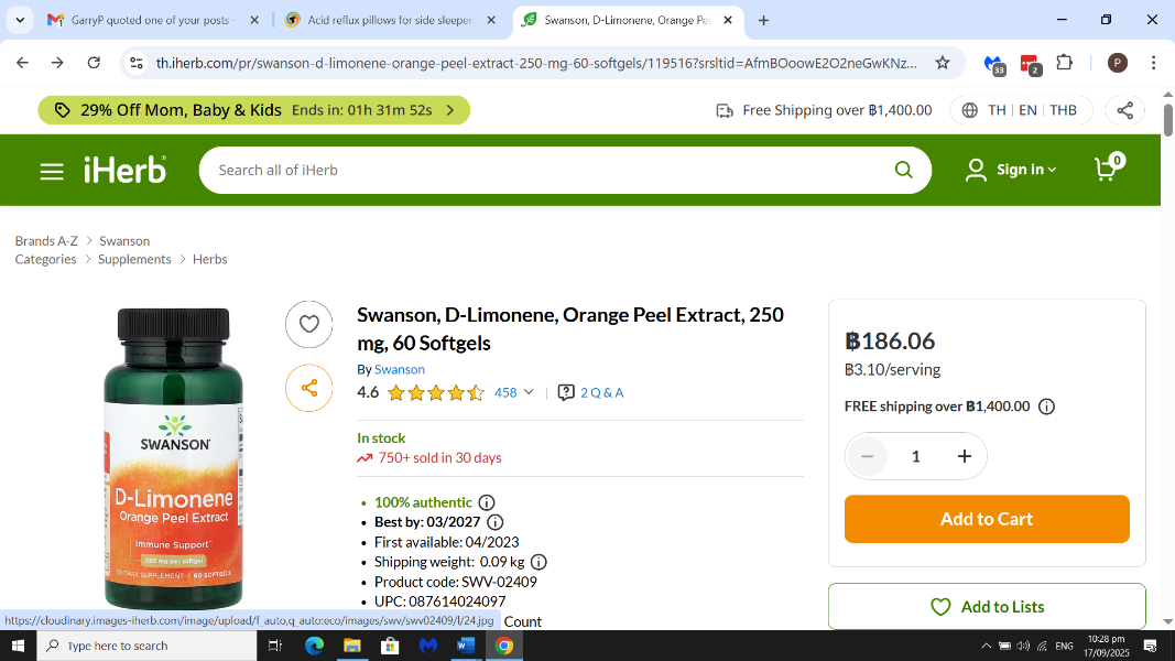 September 17, 2025Sep 17 Author 6 hours ago, xylophone said: It is available online and I think also from Lazada (and iHerb) Garry and not really too expensive. In the links I gave you, there have been some positive outcomes, however I can only speak from my experience. Certainly my stressful job didn't help, however you've got nothing to lose by trying it....... unless of course you have an hiatal hernia, in which case d-limonene probably won't be of much help. Have you been checked for this condition?? Only found liquid form on Lazada, which is not for consumption purposes, but found it on iHerb - Baht 979 for 10 capsules. I shall try to check if I can buy it anywhere else at a more reasonable price.
