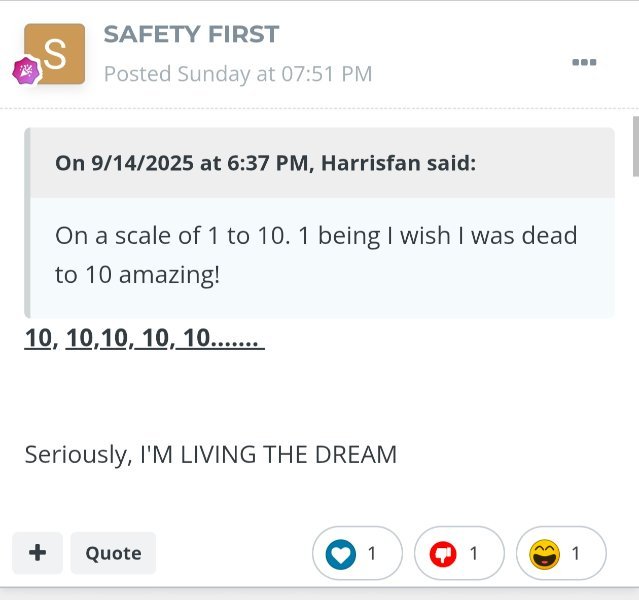 September 19, 2025Sep 19 1 hour ago, SAFETY FIRST said: Ha ha, says the miserable guy who is not enjoying life. Enjoy your unhappy day 😂 It's unlikely you're living any dream other than when you're sleeping.