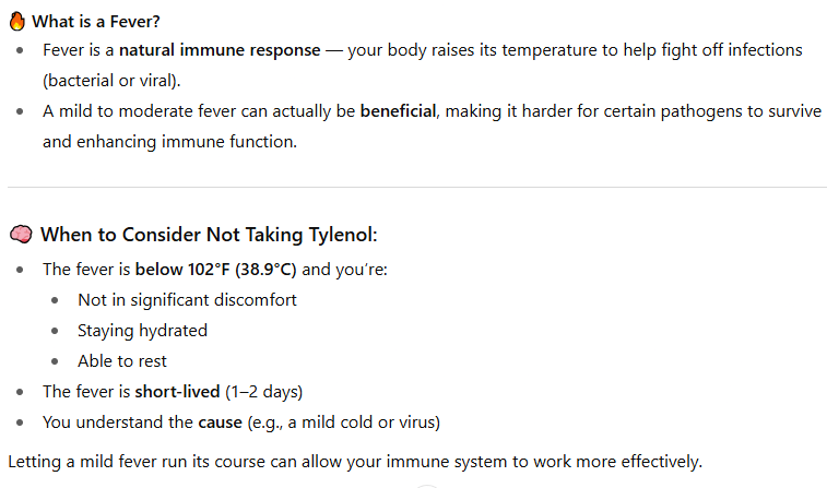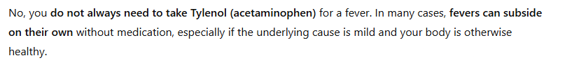 In fact, taking a Tylenol for a fever in most cases is a bad idea because you do not want to bring the fever down. The fever is doing sth positive in the body.
